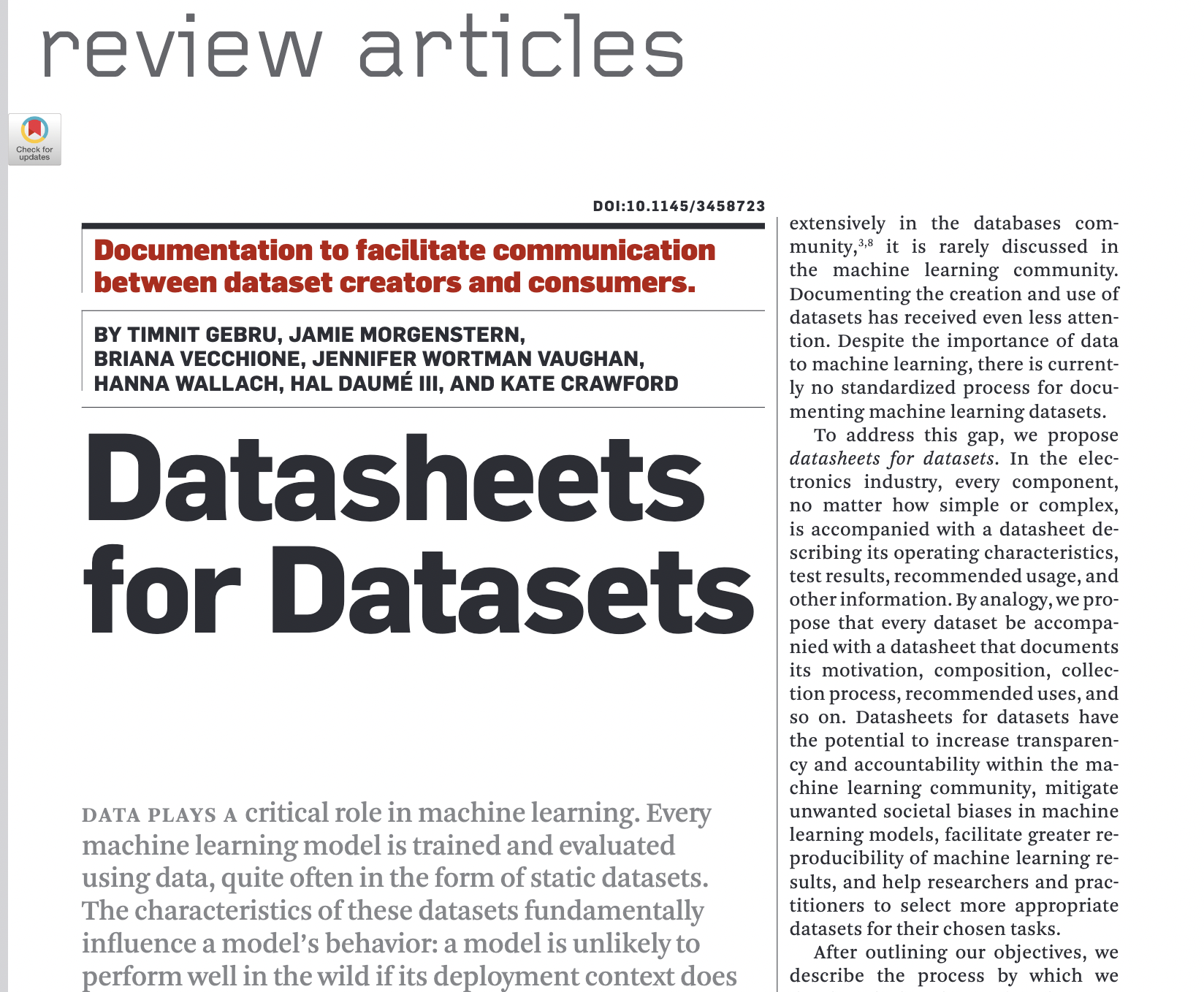 Gebru, T., et a l (2021). Datasheets for datasets. Communications of the ACM, 64(12), 86–92. doi: 10.1145/3458723