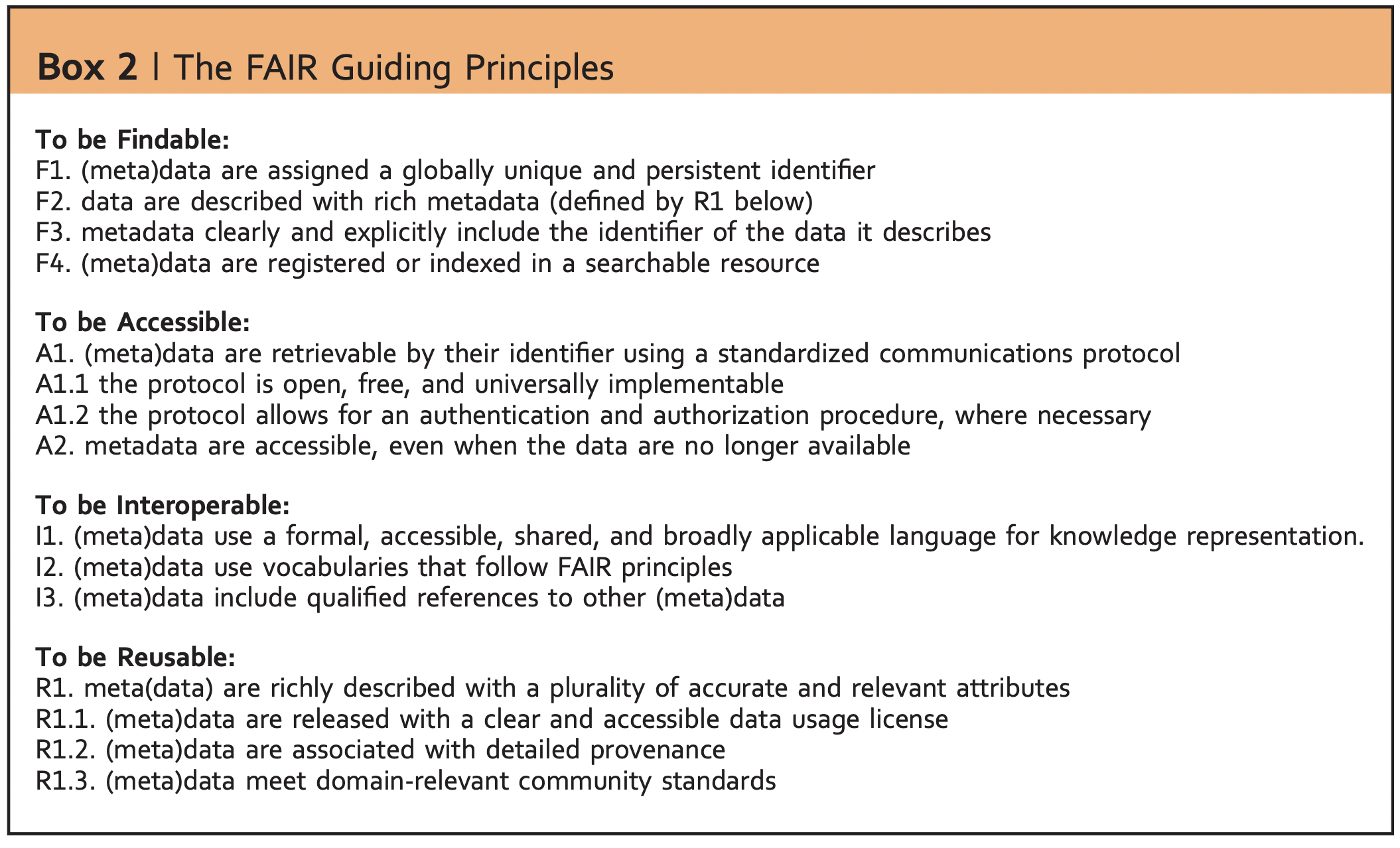 “the FAIR Principles put specific emphasis on enhancing the ability of machines to automatically find and use the data, in addition to supporting its reuse by individuals.” (Wilkinson et al, 2016)